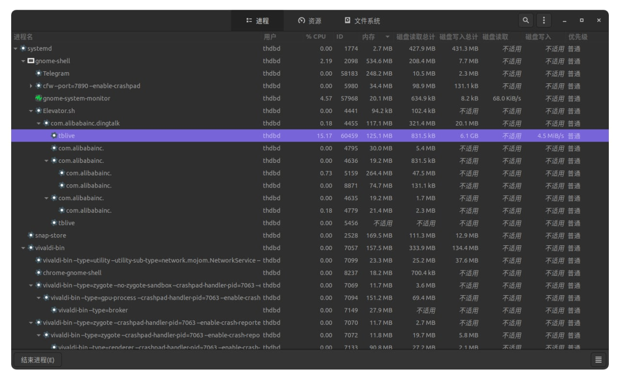 这次我选择了打开系统监视器, 于是就看到了: